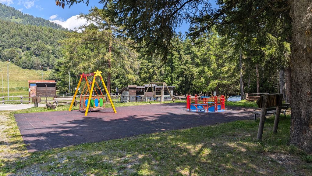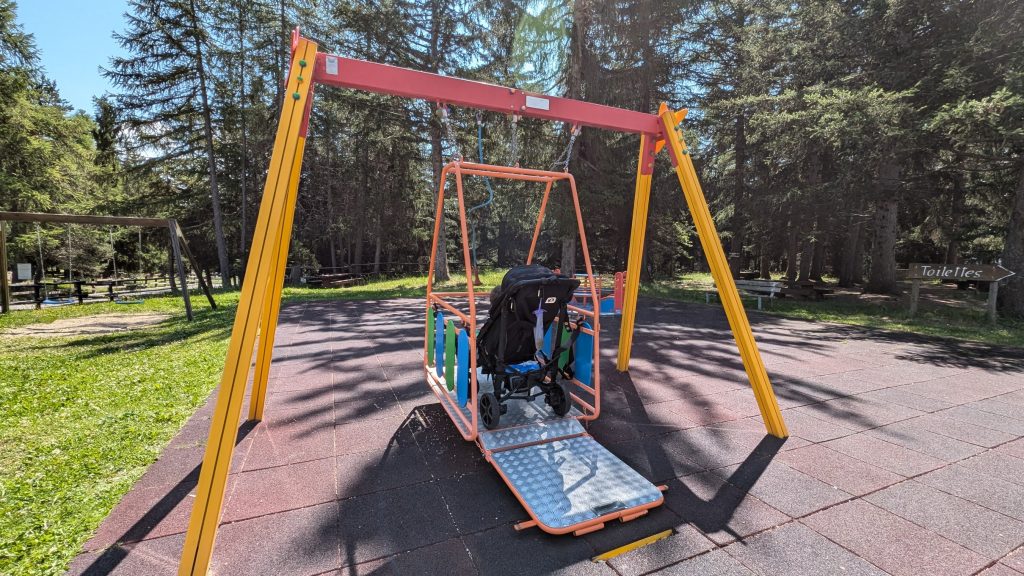 Di fronte al laghetto, dall’altra parte della strada, si trova il parco giochi con due altalene accessibili ai bambini con disabilità. Una di queste altalene è specificamente dedicata alle carrozzine. La pavimentazione in gomma colata facilita gli spostamenti.