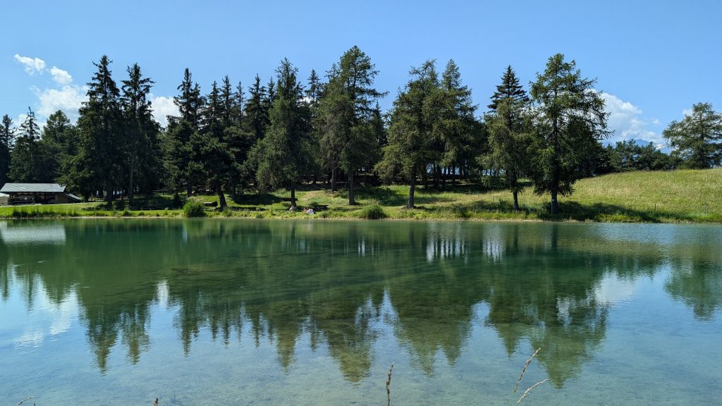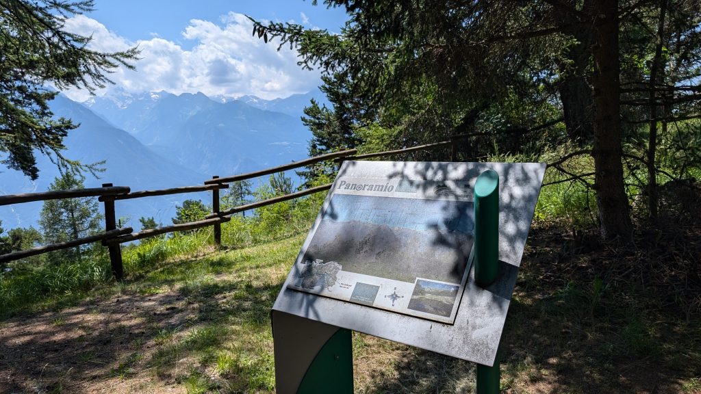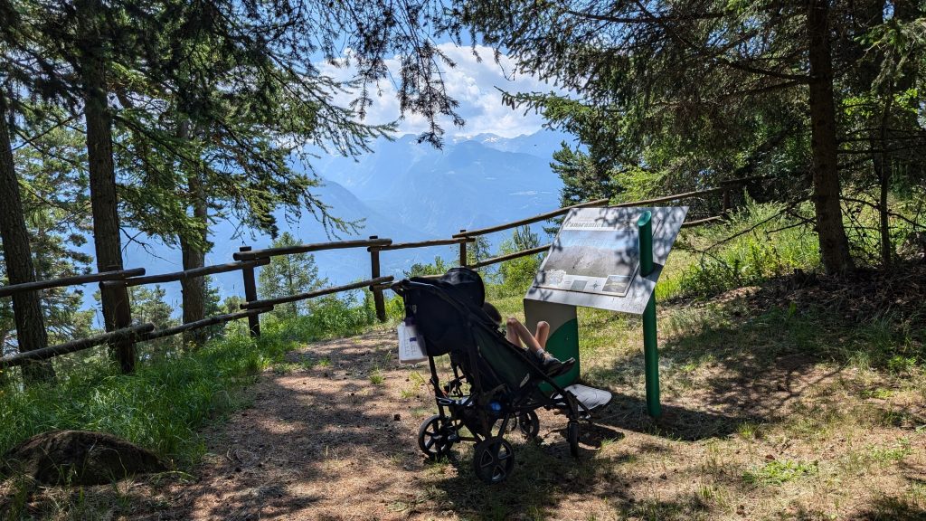 Dietro il parco giochi e la zona bagni inizia un meraviglioso boschetto con una luce splendida! Parte di questo bosco è accessibile e vi consigliamo di esplorarlo. Dopo un piccolo ponticello, troverete una terrazza con vista sulla vallata centrale e un cartello che spiega le cime circostanti. Il cartello è posizionato ad un’altezza adeguata per essere letto anche da persone con disabilità motoria.
