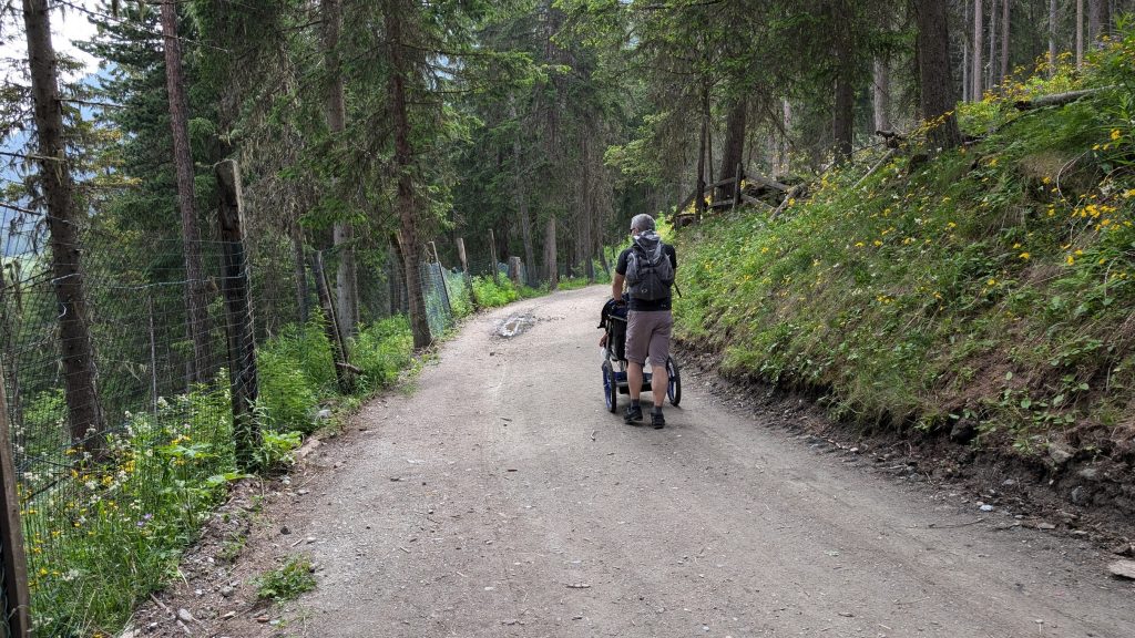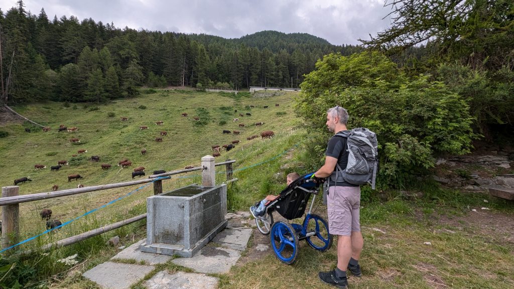 La salita per arrivare fin qui è abbastanza impegnativa, soprattutto per superare il parco avventura, ma fattibile. È meglio se ci sono almeno due persone per spingere la carrozzina o il passeggino per alternarsi. Ci sono anche alcune barriere architettoniche di piccola entità, ma che comunque richiedono un po’ di forza per essere superate.