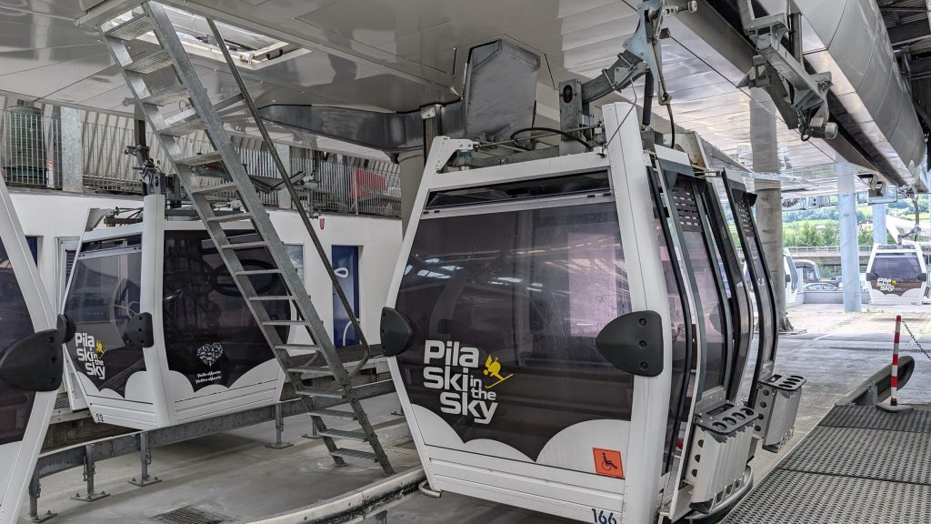Pila, sia d’estate che d’inverno, è raggiungibile, oltre che via strada, con diverse telecabine da 8 posti. Consigliamo vivamente questa via! Potete lasciare l’auto nel piazzale gratuito della telecabina, vicino alle casse, dove ci sono anche due posti riservati alle persone con disabilità. Recatevi alle casse per acquistare i biglietti: il costo di andata e ritorno è di 8 euro, ma le persone con disabilità e i loro accompagnatori viaggiano gratuitamente.